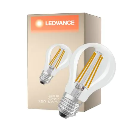 Ledvance Classic LED E27 Poire Filament Claire 3.8W 806lm - 827 Blanc Très Chaud | Équivalent 60W est le produit de remplacement parfait pour votre ancienne ampoule de 60W avec un culot E27 grâce à sa technologie LED. Passer à la LED vous offrira de nombreux avantages !