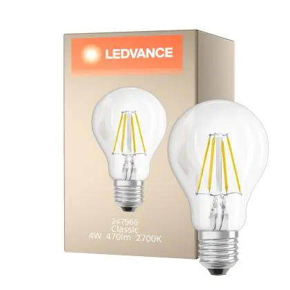 Ledvance Classic LED E27 Poire Filament Claire 4W 470lm - 827 Blanc Très Chaud | Équivalent 40W est le produit de remplacement parfait pour votre ancienne ampoule de 40W avec un culot E27 grâce à sa technologie LED. Passer à la LED vous offrira de nombreux avantages !