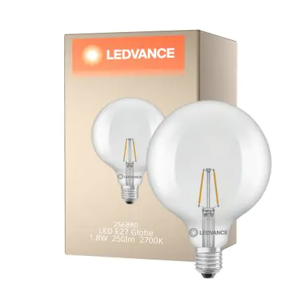 Ledvance Classic LED Globe LED E27 Globe Filament Claire 1.8W 250lm - 827 Blanc Très Chaud | Équivalent 25W est le produit de remplacement parfait pour votre ancienne ampoule de 25W avec un culot E27 grâce à sa technologie LED. Passer à la LED vous offrira de nombreux avantages !