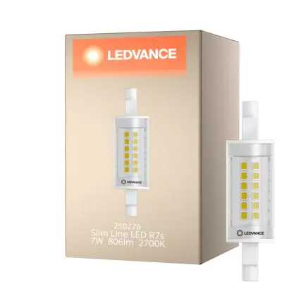 Ledvance Slim Line LED R7s 78mm Claire 7W 806lm - 827 Blanc Très Chaud | Équivalent 60W est le remplacement parfait pour vos lampes halogènes traditionnelles R7s de 60W avec un code couleur 827 Blanc Très Chaud. Les ampoules LED ne produisent pas de chaleur et n’émettent pas de radiation UV. Passez à la LED vous offrira de nombreux avantages !