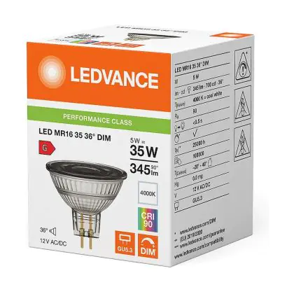 Vous pouvez économiser jusqu’à 90% sur votre dépense énergétique et vos coûts de maintenance en raison de la faible consommation d’énergie de cette ampoule de 5W et sa longue durée de vie de 25000 heures. Les lampes halogènes traditionnelles GU5.3 ne durent que 2000 heures. Ces ampoules LED ne produisent pas de chaleur et n’émettent pas de radiation UV. Installez une ampoule est très facile : retirer l’ancienne ampoule GU5.3 de la prise lorsque celle-ci s’est refroidie. Mettre la nouvelle ampoule GU5.3 dans la prise. Ce produit de haute qualité Ledvance est à partir de . Vous pouvez utiliser ce produit en toute quiétude grâce à notre garantie totale Lampdirect.be de 5 ans.