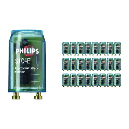 Les Starters S10 18-75W SIN sont des starters conventionnels qui permettent d’allumer les lampes fluorescentes avec un ballast électromagnétique. Ils sont adaptés pour des tubes de puissance 18 à 75W. Ils permettront d’augmenter la durée de vie de vos tubes de 25%. Leur tension est de 220-240V et ils sont équipés d’un condensateur. Les Philips S10 Starter 4-65W SIN sont recyclables et écologiques car ils ne contiennent pas de plomb et ne sont pas radioactifs. Vendues ici par lot de 25, cela vous permet de faire d'incroyables économie! Conseil : Lorsque vous remplacez vos tubes fluorescents, veillez à remplacer également le starter.