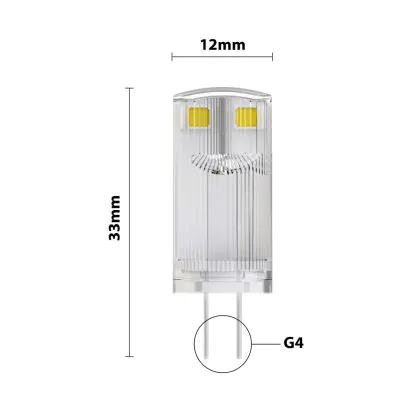 Vous allez bénéficier d'un éclairage durable par rapport à une ampoule halogène G4. Par ailleurs, les LED sont bien meilleures pour l'environnement, car elles ne contiennent pas de substances toxiques. Cependant, nous vous recommandons de comparer la taille de votre ampoule G4 actuelle avec celle de cette ampoule G4 LED. Le diamètre de ce produit est : 12mm et la hauteur est : mm. Vous saurez ainsi avec certitude si cette ampoule s'adaptera ou non à votre appareil.