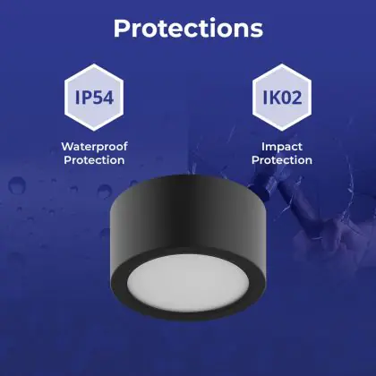 Ce downlight a unIP54 – Résistant à la poussière et aux éclaboussures (indice de protection aux intrusions de corps solides et liquides) Ainsi, le premier chiffre définit le niveau de protection contre les solides (0 = aucune protection / 6 = protection complète) et le second chiffre définit le niveau de protection contre l'intrusion d'eau (0 = aucune protection / 6 = protection contre la submersion). Votre luminaire peut être utilisé à l'extérieur à partir de l'IP 54.