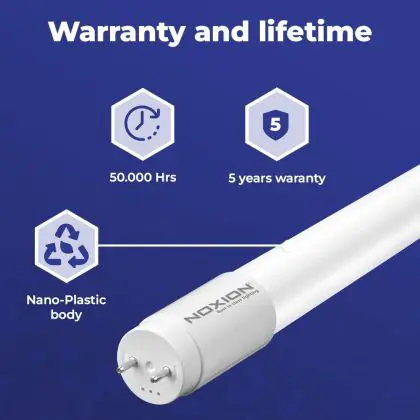 Avec le tube LED T8 Noxion, vous pouvez économiser environ 70 % de coûts énergétiques, mais aussi considérablement réduire vos frais de maintenance et de remplacement. Cela est dû à sa longue durée de vie de 50000 heures : un tube fluorescent conventionnel atteint seulement environ 24 000 heures et doit donc être remplacé beaucoup plus souvent que son équivalent LED.