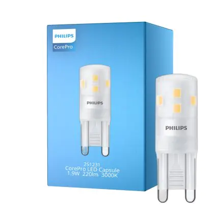 Philips CorePro LED Capsule G9 Dépolie 1.9W 220lm - 830 Blanc Chaud | Équivalent 25W est une ampoule LED G9 Philips qui vous convaincra non seulement par sa puissance particulièrement efficace de 1.9 watts, mais aussi par une longue durée de vie de 15000 heures. Le prix comprend aussi une garantie de 2 ans.