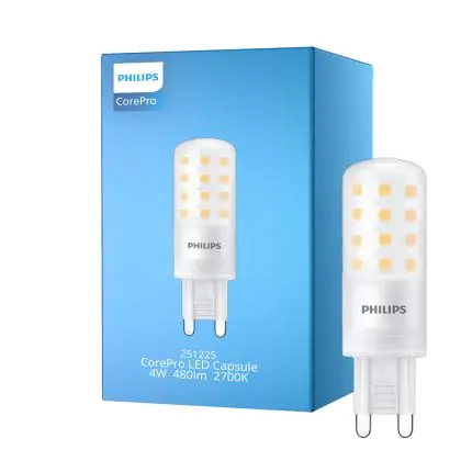 Philips CorePro LED Capsule G9 Dépolie 4W 480lm - 827 Blanc Très Chaud | Dimmable - Équivalent 40W est une ampoule LED G9 Philips qui vous convaincra non seulement par sa puissance particulièrement efficace de 4 watts, mais aussi par une longue durée de vie de 15000 heures. Le prix comprend aussi une garantie de 2 ans.