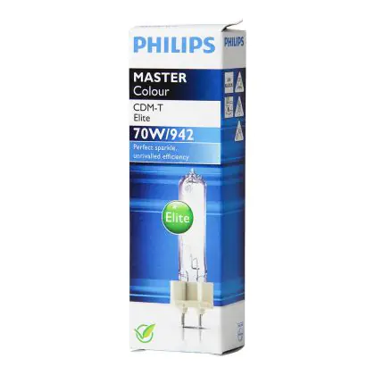 Le Philips MasterColour CDM-T Elite est une lampe à décharge équipée du culot G12. Cette lampe à halogénure métallique de 70W diffuse une lumière étincelante avec un rendu de couleurs élevé. Ces lampes à décharge compactes sont adaptées pour un éclairage général ou d’accentuation dans les magasins, les vitrines ou encore les galeries commerciales. Son flux lumineux maintenu au même niveau pendant toute l’utilisation de la lampe. Il est nécessaire d’utiliser un ballast électronique ou conventionnel afin de les faire fonctionner.