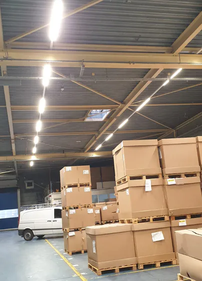 Notre client a installé des éclairages linéaires Noxion (mesurant envrion 50 mètres) dans toute la longueur de l’entrepôt. Ce type d'éclairages permet de pouvoir éclairer à 100% la surface façon uniforme. De plus, notre client a également installé des réglettes Noxion robustes et étanches dans les recoins de l'entrepôt. Afin de faciliter les déplacements réguliers du personnel dans l’entrepôt, nous avons opté pour des détecteurs Steinel. Ces détecteurs de mouvement permettent à l'éclairage de s'allumer lorsque le personnel y est présent. Une fois que tout le monde a quitté l'entrepôt, l'éclairage s'éteint à nouveau, ce qui permet de faire des économies d’énergie à l’entreprise.