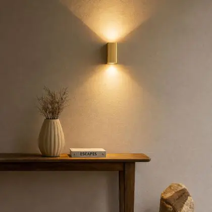 Beschrijving D'Lite Wandlamp Vrebos Aluminium Goud Up&Down| IP54 - Geschikt voor 2x GU10