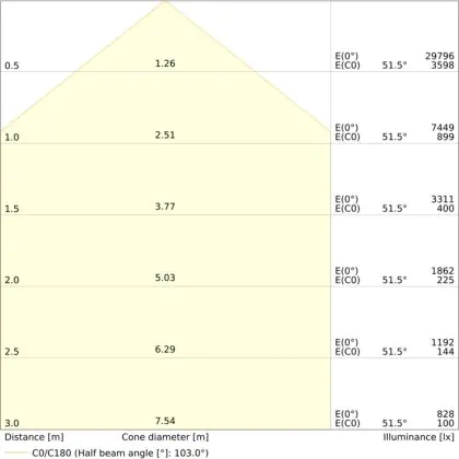 De gradenbundel geeft informatie over hoe breed het licht wordt uitgestraald. Dit zit tussen de 0 en 360 graden (D). Hoe kleiner de hoek, hoe specifieker de lichtbundel is. Over het algemeen is een smalle gradenbundel perfect voor sfeer- of accentverlichting, terwijl een brede gradenbundel ideaal is om grote oppervlaktes te verlichten.
