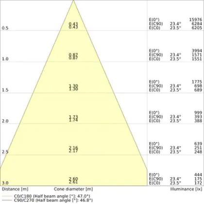 De gradenbundel geeft informatie over hoe breed het licht wordt uitgestraald. Dit zit tussen de 0 en 360 graden (D). Hoe kleiner de hoek, hoe specifieker de lichtbundel is. Over het algemeen is een smalle gradenbundel perfect voor sfeer- of accentverlichting, terwijl een brede gradenbundel ideaal is om grote oppervlaktes te verlichten.