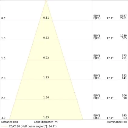De lichtopbrengst en de gradenbundel spelen een grote rol. Zo geeft de lichtopbrengst van 640 Lumen in combinatie met de 36° stralingshoek deze inbouwspot een specifieke toepassing. Kort samengevat is een lichtintensiteit van maximaal 400 Lumen ideaal voor accentverlichting, terwijl hogere waardes goed gebruikt kunnen worden als basisverlichting. Over het algemeen geldt: hoe breder de gradenbundel, hoe geschikter deze is door basisverlichting. Dit komt doordat het licht over een groter oppervlak wordt verspreid. Smallere gradenbundels (tot 40°) kunnen echter bij hoge plafonds ook goed tot hun recht komen als algemene verlichting.