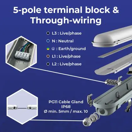 Beschrijving Noxion LED Waterdichte Montagebalk Poseidon V3.0 19-33W 2340/4200lm - 830-865 CCT | 120cm - Doorvoerbedrading (5x2.5mm2) - 3 Uur Noodverlichting