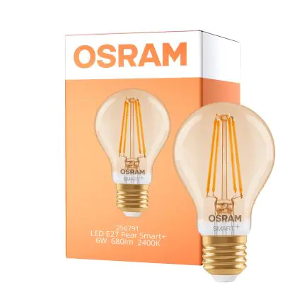 Beschrijving Osram Smart+ Matter E27 Peer Filament Goud 6W 680lm - 824 Zeer Warm Wit | Dimbaar - Via Smart Device Only - Vervangt 60W