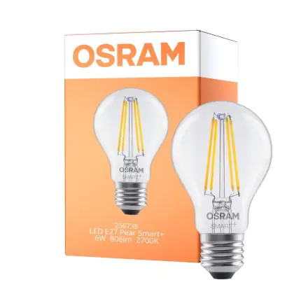 Beschrijving Osram Smart+ Matter E27 Peer Filament Helder 6W 806lm - 827 Zeer Warm Wit | Dimbaar - Via Smart Device Only - Vervangt 60W